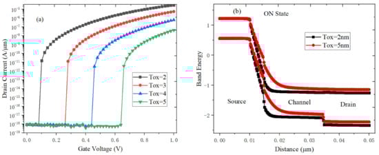 Effect of gate oxide thickness on (a) transfer characteristics, (b) on-state energy band.