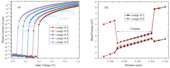 It can be found by observing Figure 8a that the on-state tunneling current increases with the germanium content of Si1-xGex material increases. This is because the germanium material can provide the smaller electron tunneling quality []. The number of tunneling electrons increase, and the band gap becomes narrower when the germanium content increases, which can improve the e-BTBT probability and SS characteristics of H-DLTFET. As shown in Figure 8b, the energy band width becomes narrower, and the energy band becomes steeper with the germanium content increases, which result in the higher e-BTBT probability. The H-DLTFET can obtain the relatively smaller off-state current and the larger on-state current when the optimal Ge content is 0.4. Therefore, the channel of H-DLTFET uses the Si0.6Ge0.4 material.