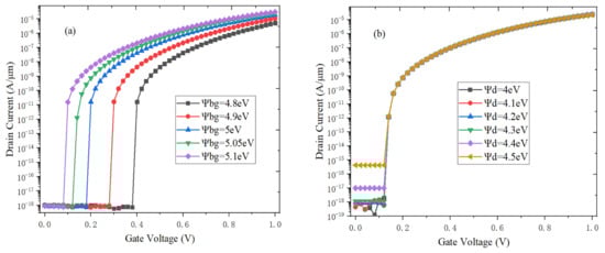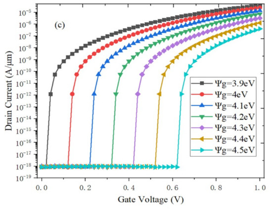 In Figure 9a, the on-state current increases and the transfer characteristic curve shifts to the left when the back-gate work function increases. The reason is that a large amount of holes are accumulated in the channel bottom when the back-gate has the higher work function. It can be seen from Figure 9b that the channel barrier height decreases with the drain work function increases, which would result in the higher carrier number and off-state current. The optimal drain work function is 4.2 eV. As shown in Figure 9c, the coupling capability between double gate and channel becomes stronger when the gate work function decreases, so the electric field of drain region increases. The electrons from the valence band of channel region can easily pass through the narrow barrier to the drain region to form the tunneling current [].
