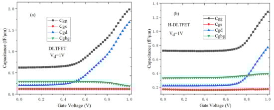 The gate capacitance (Cgg) is an important indicator for evaluating the frequency characteristics []. Figure 10a,b respectively show the C-V characteristics of DLTFET and H-DLTFET at the operating frequency f = 1 MHz. The Cgg mainly includes the gate-drain capacitance (Cgd), gate-source capacitance (Cgs) and gate-back gate capacitance (Cgbg) []. It can be seen from Figure 10 that the Cgd increases exponentially with the gate voltage increases. The reason is that the tunneling barrier width decreases when the gate voltage increases, and the inversion layer extending from drain region to source region can be formed. The Cgs is mainly composed of parasitic capacitance, and the order of magnitude is small relative to the Cgd under the inversion layer, which is weakly affected by the bias voltage. Therefore, the Cgg is mainly determined by the Cgd at the high gate voltage. Almost all electrons of H-DLTFET can be collected by the drain region immediately, and the channel electron concentration is lower, which would result in the smaller Cgg and Cgd. It can be seen from Figure 10 that the Cgg and Cgd of H-DLTFET respectively decrease from 1.98 fF/μm and 1.68 fF/μm to 1.28 fF/μm and 0.77 fF/μm compared with the conventional DLTFET, so the H-DLTFET has the better frequency characteristics.