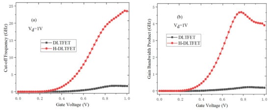In Figure 11a, the cut-off frequency increases when the gate voltage increases. This is because the on-state current and gm value increase with the electronic BTBT efficiency increases. However, the cut-off frequency has no change or even decreases when the gate voltage continues to increase to the high gate voltage. This is due to the increase of Cgg and the decrease of gm, which is caused by the mobility degradation. In addition, the cut-off frequency of H-DLTFET is much larger than that of DLTFET, which can be explained by the smaller Cgg of H-DLTFET. The larger the gm value is, the higher the cut-off frequency is.