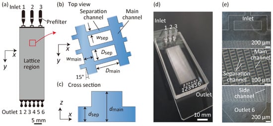 Microchannel design and photographs of the microfluidic devices. (a) Top view of Microdevices A–C, (b) enlarged image of the lattice region, and (c) cross-sectional view of the lattice region. wmain: width of the main channel; wsep: width of the separation channel; dmain: depth of the main channel; dsep: depth of the separation channel; Dmain: interchannel distance of the neighboring main channels; Dsep: interchannel distance of the neighboring separation channels. (d) Photograph of the prepared Microdevice A and (e) microscopic images showing the inlet, lattice, and outlet regions of Microdevice A.