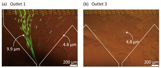 Next, we observed the separation behaviors of fluorescent standard microparticles as a model. Figure 3 shows 4.8- and 9.9-µm green particles flowing through Outlets 1 and 3 of Microdevice A, when the input flow rates from Inlets 1, 2, and 3, denoted as Q1, Q2, and Q3, respectively, were 20, 20, and 80 µL/min, respectively. Most of the large 9.9-µm particles flowed through Outlet 1, whereas small 4.8-µm particles were primarily distributed to Outlets 1, 2, and 3. This result clearly indicates that the presented dual-depth lattice-channel network can function as a size-selective sieving matrix for micrometer-sized particles. This separation result is similar to that reported in our previous study using uniform-depth lattice channels [] or in the DLD scheme [,,], in that the differences in the lateral positions (x positions) of particles are enlarged as the particles flow through the lattice region in the y direction. However, interestingly, the particle behaviors differ completely from those observed in our previous study because larger particles flow into the separation channels more frequently than the smaller particles, thus resulting in a large degree of lateral displacement distance for the larger particles.