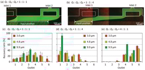 Several key operation parameters may affect the separation performances of the particles using the presented concept. First, the ratio of the input flow rates was naturally regarded as a critical factor. We therefore investigated the effect of the input flow-rate ratio, while maintaining the total flow rate Qtotal (= Q1 + Q2 + Q3) at 120 µL/min. The result is shown in Figure 4. When the ratio of the input flow rates, Q1, Q2, and Q3 was 1:1:1, the input position of particles was relatively broad (~3.8 mm; Figure 4a). The three types of different-sized particles introduced exhibited similar behaviors and were not clearly separated, even though the 9.9-µm particles were not recovered from Outlets 5 and 6 (Figure 4c). Meanwhile, when the relative ratio of the particle suspension (Q2) was decreased, i.e., when the ratio was changed to 1:1:4 or 4:1:1, the input position was narrowed to ~1.6 mm (Figure 4b). Especially in the 1:1:4 condition, where the particles were introduced from the left-side region of the lattice, a good separation was obtained (Figure 3 and Figure 4d). More than 90% of the 9.9-µm particles were recovered from Outlet 1, whereas 3.0- and 4.8-µm particles were dispersed and primarily recovered from Outlets 1 to 4. Although the separation efficiency was not sufficiently high in this condition, we clarified that a pinching effect of the particle input position had occurred. When the ratio was changed to 4:1:1, that is, the relative value of Q1 was increased, the introduction position was shifted to the right side of the lattice. In this condition, most of the particles were recovered from Outlets 4 to 6, regardless of the particle size, and particle separation was not achieved (Figure 4e). This result clarified that the input position was a highly critical factor dominating the particle separation performances. A higher separation precision may be expected when the relative value of Q2 is further lowered; however, we performed particle separation experiments at the input flow rate ratio of 1:1:4 in the following experiments, to ensure a relatively high throughput of particle separation.