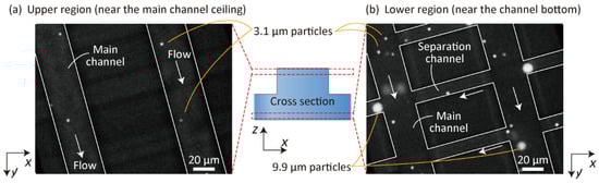 To elucidate the separation mechanisms in detail and to strengthen our theory as depicted in Figure 1, we observed the behaviors of green fluorescent 3.1- and 9.9-µm particles in the lattice region using high-speed confocal microscopy. A buffer solution and the particle suspension were introduced into Microdevice A at Q1, Q2, and Q3 of 2.0, 2.0, and 8.0 µL/min, respectively. Particles flowing near the ceiling of the main channel and those near the bottom surface were individually observed. The flows of the particles are shown in Figure 5 and Supplementary Video S1. Near the ceiling of the microchannel, we primarily observed 3.1-µm particles flowing along the main channel, but the number of large 9.9-µm particles was extremely small. It was assumed that the large particles could not reach the ceiling of the microchannel when they were flowing from the shallower separation channel into the deeper main channel, because of the hydrodynamic constriction effects for the large particles, as in the case of PFF []. By contrast, 9.9- and 3.1-µm particles, flowing near the bottom surface, frequently entered the separation channels (Figure 5b). Furthermore, we observed that 3.1-µm particles flowed in the upper and/or lower direction (+z or -z direction) more frequently than the 9.9-µm particles. Once the small particles reached the ceiling of the main channel, they flowed along the main channel. These observations clarified that the separation mechanism of this scheme utilized 3D flows in the planar lattice-shaped microchannel networks, as explained in Figure 1.