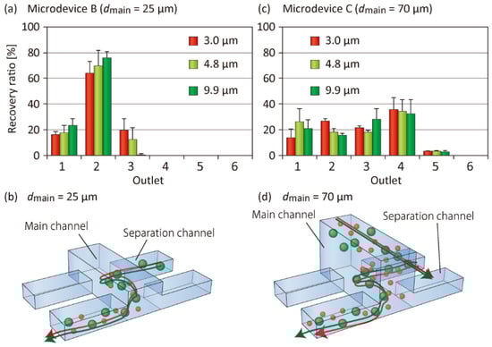 In addition to the operation parameters, various geometric parameters of the microchannels affect the separation behaviors of the particles. Among various factors, we investigated the effect of the main channel depth dmain on particle separation performances. In addition to Microdevice A with dmain of 40 µm, we fabricated two microdevices, Microdevices B and C, with dmain values of 25 and 70 µm, respectively (Table 1). The results of particle separation are shown in Figure 6. In Microdevice B, the three types of particles introduced were primarily recovered from Outlet 2, and significant differences were not observed between these particles (Figure 6a). This result suggested that the particle migration in the upper (z) direction was suppressed, because the particles, once introduced from the separation channel into the main channel, could easily be reintroduced into the separation channel (Figure 6b). By contrast, when Microdevice C was used, the particles were almost randomly distributed to Outlets 1–4 (Figure 6c). It was likely that the particles, once they had reached near the ceiling of the main channel, flowed along the main channel and never flowed near the channel bottom, and were recovered from Outlets 3–4. Meanwhile, particles flowing near the bottom surface would be frequently introduced into the separation channels, regardless of the particle size (Figure 6d). Consequently, we confirmed that Microdevice A with dmain of 40 µm was the optimal device among the three types of devices for separating microparticles with this size range.