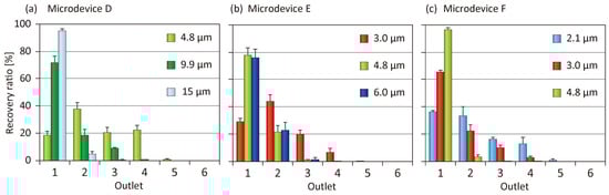Separation results of model particles with different similitude ratios; (a) similitude ratio was 1.5 (microdevice D), (b) similitude ratio was 0.66 (microdevice E), and (c) similitude ratio was 0.5 (microdevice F). The Qtotal and Q1:Q2:Q3 were 120 µL/min and 1:1:4, respectively. Each dataset presents the mean ± SD from three individual demonstrations.