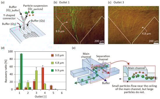 (a) Schematic image showing Microdevice A with an attached Y-shaped connector. (b,c) 4.8- and 9.9-µm particles flowing near Outlets 1 and 3. (d) Result of particle separation when Q1, Q2_particles, Q2_buffer, and Q3 were 20, 2, 18, and 80 µL/min, respectively. Each set of data represents the mean ± SD from three individual experiments. (e) Schematic image showing the particle behaviors in the lattice channel, when the input position of the particles was restricted to the upper region.