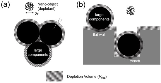 In the field of colloid science, control of dispersion and aggregation of colloidal particles is important, and interactions between them and with other macro-objects have been studied extensively [22]. The van der Waals force and electrostatic interaction are major forces that depend on the physical properties of the material. In contrast, the excluded volume effect (or depletion interaction) has a different origin. This interaction becomes apparent when a large number of nanoparticles or polymer molecules are present in a medium containing larger suspended components. In this situation, a region in which those nano-objects cannot exist, within the thickness equivalent to their radius, appears around the surface of large components due to the steric repulsion (excluded volume). Since this region is as almost a pure solvent, the chemical potential is greater than the surrounding bulk polymer solution. Consequently, the contact of large components is enhanced to reduce the total excluded volume due to mutual overlapping to lower the free energy of the system [23,24].