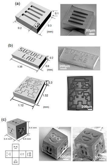 All template components used in this study, presented in Figure 2a–c (also see Supplementary Materials Figure S1), are designed using CAD software (Rhinoceros 5.0; AppliCraft, Tokyo, Japan). The data, converted to bitmap image slices with spacing of 10 μm by employing a data preparation software (Magics, Materialise Japan, Tokyo, Japan), are processed by a 3D stereolithography tool (Acculas SI-C1000, D-MEC, Tokyo, Japan) with epoxy-based UV curable resin (KC-1257, D-MEC, Tokyo, Japan). After completion of consecutive layering and exposure steps, a glass substrate, on which stereolithography products are present, is cut into a smaller piece by a diamond cutter. Then, this piece is put inside a 50 mL plastic tube and immersed in a solvent (EE-4210, Olympus, Tokyo, Japan) for at least 30 min to remove uncured resin. After replacing the solvent with ethanol, an ultrasonic wave is applied in the bath for 10 min to release the fabricated parts from the glass substrate. Finally, ethanol is replaced by Milli-Q water to store the template components. The scanning electron microscope (SEM) images are, thereafter, obtained by VE-8800 (Keyence, Osaka, Japan).