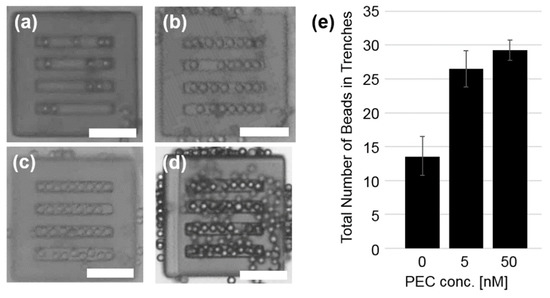 The average number of beads confined in the trench region per template is plotted in Figure 3e. As the trench’s length is 200 μm, only 10 beads of 20 μm diameter can be packed in one line; however, due to the slight shrinkage of resin in manufacturing, only 9 beads in one line could be packed (e.g., Figure 3c; top line). Thus, 36 beads are required to tightly and completely fill all four trenches. At cPEG = 0 and 5 nM, the average numbers of confined beads among four plates are 13.5 and 26.5, respectively, with relatively large variation (C.V. ~ 22% and 10%, respectively). Meanwhile, at cPEG = 50 nM, the average number of confined beads reaches ~29 (81% of the complete packing) and C.V. is reduced to ~5%, indicating reproducible results. We decided to employ cPEG = 50 nM in all of the following experiments.