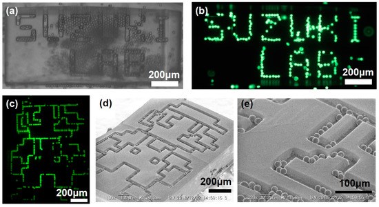 Assembly of fluorescent beads on the flat template having designed patterns trenches. (a) Bright field and (b) fluorescence microscope images of beads assembled letters. (c) Fluorescence microscope image and (d,e) SEM images of beads assembled to the pattern of a character.