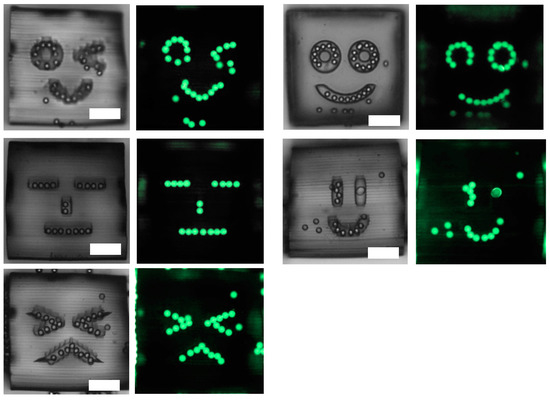 Assembly of beads on faces engraved on five faces of a cube. Left: Bright field images and Right: Fluorescent images. All scale bars represent 100 μm.