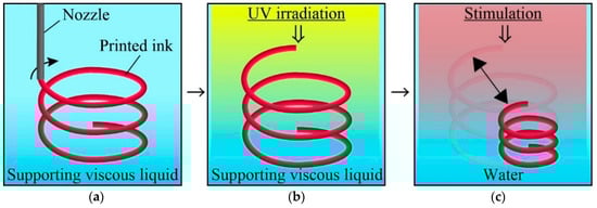 In terms of the materials used for 4D printing, stimuli-responsive polymers [9] and hydrogels [10] have mainly been adopted. In particular, stimuli-responsive hydrogels have been applied to drug delivery systems [11] and soft actuators [12,13], owing to their biocompatibility and softness. Using stimuli-responsive hydrogels, 4D microstructures have usually been printed using photolithography [14,15,16,17,18] and deposition printing on substrates [19,20,21,22,23]. For all these methods, fabricated hydrogel structures are mainly layered structures, creating bending or twisting motions for the printed structures. However, it is difficult to fabricate 4D structures with internal gaps or suspended beam structures, both of which can be critical to achieving complex motions and encapsulating materials or micro-channels inside structures for soft robots or medical tools.