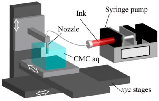 The ink was injected using a syringe pump (LEGATO 180, KD Scientific, Holliston, MA, USA) through a nozzle composed of SUS304 (NN-2225R, TERUMO, Tokyo, Japan) in CMC aq, using xyz stages (OSMS20-(XY), OSMS26-(Z), SIGMAKOKI, Tokyo, Japan). The nozzle was fixed with a jig. The program of the stages was set using sample103 (SIGMAKOKI). Figure 2 illustrates the setup for our printing system.