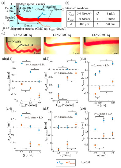 To investigate the printing performance of the ink in CMC aq, we evaluated the printed position of the ink. We printed a straight 20 mm line of ink and measured the top and bottom positions (z-axis) of it, ztop and zbottom, respectively, at 10 mm from the nozzle (Figure 3a). We tested six parameters: Two liquid parameters (the concentrations of NaAlg in the printed ink CNaA and CMC in the supporting viscous liquid CCMC), two ejection parameters (the diameter d of the nozzle and the flow rate Q of the ejected ink solution), and two printing parameters (the stage speed v and the depth of the nozzle h). The listed values for these parameters (Figure 3b) were set as a standard condition for the experiment. These parameters were varied one at a time to examine the effect on the printed ink pattern. For example, Figure 3c presents the images of printed ink patterns in the z-axis when CCMC was varied as 0.4%, 1.0%, and 1.6%.
