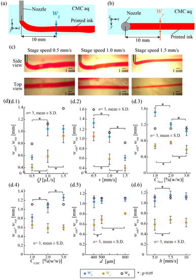 The widths of the printed ink, wz and wy, varied depending on Q and v (Figure 4d.1,d.2). Both widths increased when Q increased or v decreased. This tendency matched with the theoretical description in Equation (1). For the liquid parameters, wz decreased as CNaA increased, although wy remained constant (Figure 4d.3). Furthermore, wz increased as CCMC increased, although wy also remained constant (Figure 4d.4). We consider that the changes in wz resulted from the drag force in the z-direction caused by the pressure loss around the nozzle. The two parameters d and h did not influence wz and wy (Figure 4d.5,d.6).
