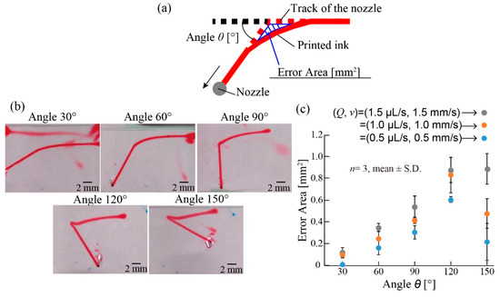 As shown in Figure 5b, the patterned ink (v = 1.0 mm/s, Q = 1.0 µL/s) was distorted depending on the angle of the corner. We examined the relationship between the error area Aerror and corner angle θ for three different nozzle speeds and flow rates (v = 0.5, 1.0, and 1.5 mm/s: Q = 0.5, 1.0, and 1.5 µL/s, respectively) to keep the diameter of the printed ink patterns constant. The error area Aerror increased as the angle θ increased, reaching the maximum when θ was 120° for all three nozzle speeds (Figure 5c). For all angles θ, the slower the nozzle speed v, the lower the error area Aerror. According to these results, to print a corner pattern precisely, a small flow rate and slow stage speed should be chosen.