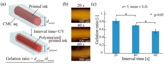 Acryloxyethyl thiocarbamoyl rhodamine B (0.002% (w/w)) was added to the printing ink to visualize the polymerized hydrogel. After printing a 20 mm straight line of the ink under the standard printing condition (Figure 3b: CCMC = 1% (w/w), v = 1.0 mm/s, Q = 1.0 µL/s, d = 400 µm, and h = 5 mm), the printed ink was exposed to UV light (170 mW/cm2, HLR100T-2, SEN LIGHTS CORPORATION, Osaka, Japan) at an interval time of 20–60 s after printing. After the irradiation, the container of CMC aq was placed into a beaker filled with water to replace CMC with the water to obtain the polymerized ink. The polymerized ink was placed into water that had settled at room temperature, imaged using a fluorescence microscope (IX73P1-22FL/PH, OLYMPUS, Tokyo, Japan), and measured using imaging software (Cellsens, OLYMPUS). Then, we obtained the gelation ratio (dpolymer/dinitial, where dpolymer is the diameter of the polymerized ink and dinitial is the width of the printed ink).