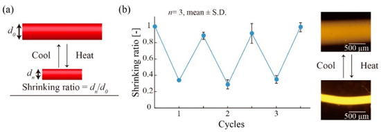 When heating, the polymerized printed ink was placed into heated water (48 °C), which was heated to the specific temperature using a hotplate (ND-1, AS ONE). The temperature of the water was measured using a thermometer (HI98501, Hanna Instruments, Woonsocket, RI, USA). When cooling, the polymerized printed ink was placed into water that had settled at room temperature. The heated or cooled polymerized ink was imaged using a fluorescence microscope and measured using the Cellsens software. Then, we obtained the shrinking ratio (wn/w0, where wn is the diameter of the heated or cooled polymerized ink and w0 is the initial diameter of the polymerized printed ink).