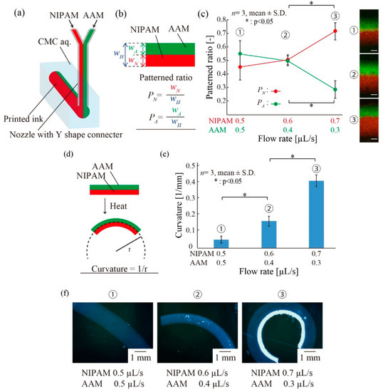 In addition to investigating the simple shrinking/swelling motions of the printed hydrogel patterns, the printing of multiple types of materials was performed, enabling various deformations. We utilized two different pre-gel inks, NIPAM-based and AAM-based, and infused these inks to the nozzle simultaneously via a Y-shaped connecter (Figure 8a). After UV irradiation, the polymerized hydrogel pattern exhibited a double-layer structure. We prepared three different double-layer hydrogel structures which were fabricated by NIPAM/AAM flow rates of 0.5/0.5 µL/s, 0.6/0.4 µL/s, and 0.7/0.3 µL/s. First, we investigated the printing pattern of the double-layer structure by measuring the patterned ratios PN and PA (PN = wN/wH, PA = wA/wH, where wN is the width of the pNIPAM gel, wA is the width of the pAAM gel, and wH is the total width) (Figure 8b). Figure 8c shows that PN increased and PA decreased when the flow rate of the NIPAM ink increased and that of the AAM ink decreased. Next, we investigated the responsivity of the double-layer structure to a thermal stimulus. The pNIPAM hydrogel responds to thermal stimuli, whereas the pAAM hydrogel does not. Thus, a folding motion of the polymerized double-layer hydrogel pattern can be achieved in response to a thermal stimulus. We measured the curvatures of these double-layer hydrogel patterns after heating (Figure 8d). The curvature of the double-layer hydrogel structure increased when the flow rate of the NIPAM-based ink increased (Figure 8e,f). A large curvature resulted from increasing the cross-sectional area of the pNIPAM. Figure 8c,e shows that a large curvature can be achieved by setting a large flow rate for the NIPAM ink to increase PN. These results suggest that deformation control can be achieved by printing multi-hydrogels with controlled layer thicknesses by adjusting the flow rate of the ink.