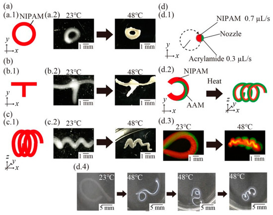 Finally, we printed the character “C” by moving the stages in a “C” shape and ejecting NIPAM-based (0.7 µL/s) and AAM-based (0.3 µL/s) ink at the same time (Figure 9d.1). The printed structure exhibited twisted ink patterns and deformed three-dimensionally into a spiral shape (Figure 9d.2). Figure 9d.3 presents the images of the fabricated structure, a spring shape, and its response. Figure 9d.4 presents the time-lapse images of the deformation. Figure 9d.3,d.4 shows that the fabricated 4D structure can deform three-dimensionally by printing with multi-hydrogels. By printing internal gaps and multi-hydrogels, 4D structures can exhibit various deformations in response to external stimuli, as there is space in which to deform. These results suggest that our proposed method could enable the printing of complex 4D multi-hydrogels structures with cross points and internal gaps.