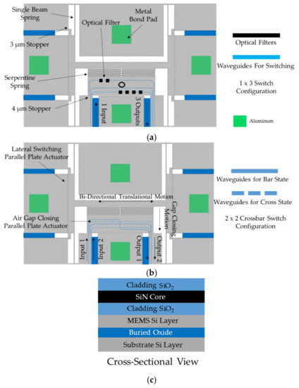 - Liu, H.B.; Chollet, F. Moving polymer waveguides and latching actuator for 2 × 2 MEMS optical switch. J. Microelectromech. Syst. 2009, 18, 715–724. [Google Scholar]