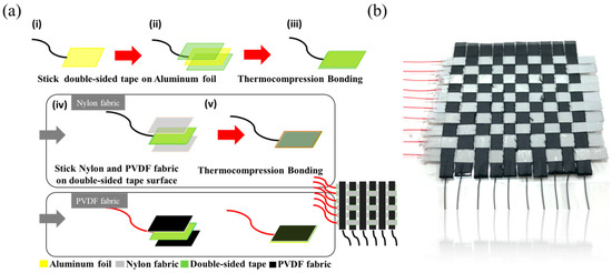 The WTENG fabrication primarily consists of preparing the individual PVDF nanofiber and nylon based single electrodes followed by weaving them together. The systematic fabrication protocol is schematically illustrated in Figure 2a. First, an aluminum foil (5 mm × 60 mm) with a soldered copper wire is coated on both sides with a 50 µm thick double-sided tape (Taiwan Nitto Co., Ltd., Taichung, Taiwan). The PVDF based electrode is obtained by attaching the PVDF nanofiber mat to each side of the aluminum foil using thermocompression bonding. The nylon-based electrode is obtained in a similar way by attaching the nylon cloth to both sides of the aluminum foil. Lastly, the prepared PVDF and nylon based single electrodes are woven together to form a 10 × 10 WTENG, which has a total area of about 60 mm2, as shown in Figure 2b.
