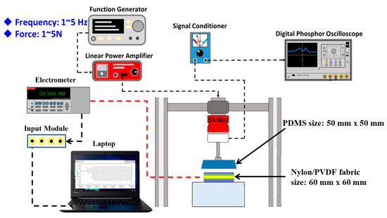 We have utilized a standard dynamic testing platform as shown in the schematic in Figure 3 to test the electrical output of the WTENG when mechanically contacted with a freestanding dielectric elastomeric layer (PDMS 184) under different applied forces and frequencies. A function generator (AFG3022, Tektronix Inc., Beaverton, OR, USA) linked to a linear power amplifier (PA25E, Brüel & Kjær Co., Nærum, Denmark) was used to control the excitation frequency and normal force exerted by the shaker, respectively. A force feedback sensor attached to the front of the shaker measures the applied contact force, which is displayed as voltage waveforms on the digital phosphor oscilloscope after signal conditioning. A 50 mm2 PDMS layer is attached to the tip of the force sensor as it contacts the surface of the 60 mm2 WTENG that is fixed on an acrylic block. The open circuit voltage and the transferred charge were measured using an electrometer (Keithley 6514 System Electrometer, Beaverton, OR, USA) with a high input resistance. For simulating human motion such as walking and arm movement, the WTENG was contacted under different forces and frequencies and the resulting electrical output was measured by the electrometer.