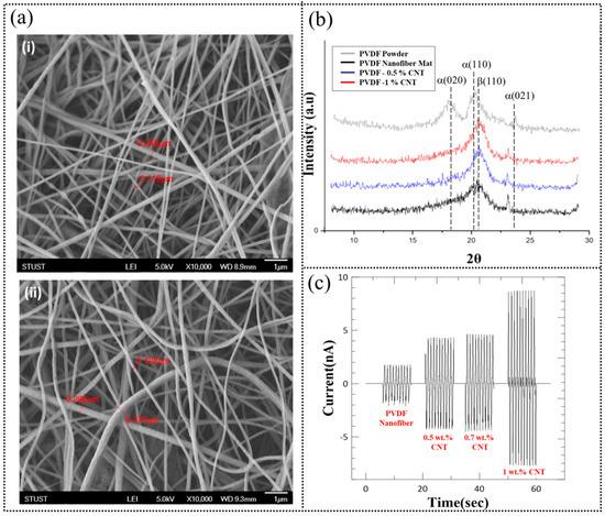 - Kim, S.; Song, Y.; Heller, M.J. Influence of MWCNTs on β-Phase PVDF and Triboelectric Properties. J. Nanomater. 2017, 2017, 2697382. [Google Scholar] [CrossRef]