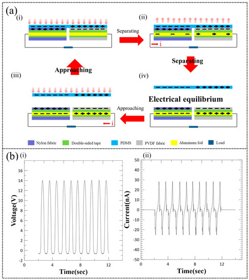 (a) Schematic of structure and working mechanism of freestanding TENG (FTENG) under vertical contact mode as the freestanding PDMS layer approaches contacts and separates from the FTENG. (b) Electrical performance of the FTENG: (i) Voltage output and (ii) current output.