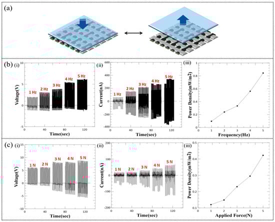 (a) Schematic of WTENG working mechanism under non-deformation mode where PDMS is chosen as the freestanding triboelectric layer. (b) The measured (i) voltage (ii) current and (iii) power density when the WTENG is contacted by the freestanding PDMS layer under varying (b) applied frequencies (1–5 Hz) and (c) contact forces (1–5 N).