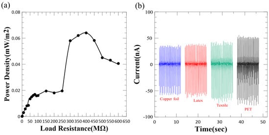 To characterize the practical applicability of the proposed WTENG as a power source, we measured the power density under different load resistances as shown in Figure 7a. A maximum instantaneous output power density of 0.065 mW/m2 was observed at a load resistance of 400 MΩ. Furthermore, we have also tested the current output of the WTENG when contacted with free standing triboelectric layers made of different materials as shown in Figure 7b. The peak-to-peak current of the WTENG when contacted with copper foil, latex, textile and PET (Polyethylene Terephthalate) under a normal applied force of 5 N (3 Hz) was 90, 95, 105 and 130 nA, respectively. This implies that PET is a relatively better triboelectric material for the WTENG. Furthermore, an output current of 105 nA for textile shows promise for applicability in wearable devices.