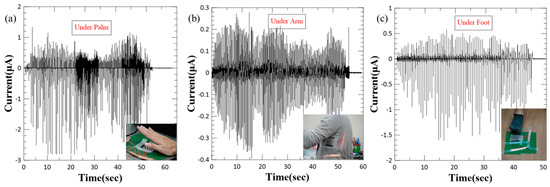 Owing to its wearability, flexibility and ability to be triggered by any freestanding triboelectric layer, the proposed WTENG could be easily integrated into clothes, gloves, shoes and carpets. Besides the above tested materials like PDMS, latex, and PET; the freestanding triboelectric layer could also be wool, cotton, polymer, paper, the hand and so on. For example, a 5 cm2 WTENG placed on a table and tapped using the hand could generate a maximum peak-to-peak current of about 4 µA as shown in Figure 8a. The movement of hands, legs and arms represents important sources of mechanical energy provided by the human body. We have also integrated the same WTENG into clothing and can harvest energy by the motion of the arm as shown in Figure 8b. Here, the clothing material represents the freestanding triboelectric layer. The movement of the arm causes a change in the contact area between the WTENG and the clothing, resulting in a maximum peak-to-peak output current of about 0.6 µA. We have also demonstrated the feasibility of integrating the WTENG into floor mats. The WTENG was attached to the floor and the triboelectric effect resulting from stepping on it while walking generated a maximum peak-to-peak output current of about 2 µA as shown in Figure 8c. Based on a similar concept, the WTENG may also be attached to the bottom of shoes to harvest mechanical energy from walking or running.
