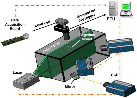 For simultaneous PIV and direct-thrust force measurements, a 0.1 kg load cell (GSO-100, Transducer Techniques, Temecula, CA, USA) was attached to a cantilever beam holding a mini DC motor (A-max 22 type, Maxon motor, Fall River, MA, USA) coupled to the flagella models through a delrin coupling. The thrust measurement system was characterized in our earlier studies [54,55,56]. Calibration of the load cell was performed using small specific loads where optimal gain and bias of the load cell was adjusted prior to simultaneous PIV measurements. The drive line was first tested by running in air and water to check for possible vibrations and disturbances. Mean deviation of the force was measured to be almost zero (<1%) and the oscillation amplitude, an indicator to assess any source of disturbances, was significantly low (~1 mN) compared to the predicted thrust force values (26–130 mN) using the RFT. During experiments, the thrust force induced by the helix was obtained from the difference between the mean thrust force measured at the motor stop position and the running position in the silicone oil after sufficient time had passed in order to sustain the steady-state conditions of mean values. The actual thrust history was found to be oscillatory in-phase with the rotational speed due to finite-flagella. Six sets of direct force measurements were performed and included for final comparisons with the PIV measurements and RFT approximations. Fabricated prototype single rigid helix was rotated at 1–5 Hz motor speeds range, whereas, 3–7 Hz motor speeds were applied for the experiments with flagellar bundles, i.e., two helices arranged in tandem.