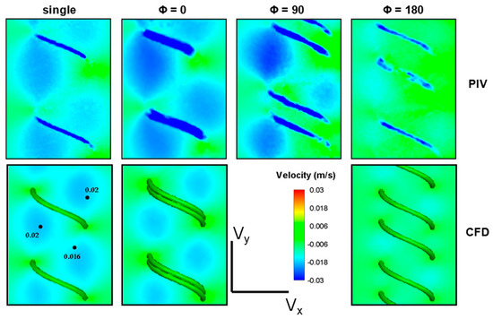 Figure 5. The axial velocity component, Vy in the center plane acquired using PIV measurements (top row) and CFD simulations (bottom row). Compared to the single flagellum, a slight increase is observed for the in-phase (Φ = 0) double flagella configuration. In comparison, the two out-of-phase (Φ = 90 and Φ = 180) double flagella configurations demonstrated a decrease in Vy affecting the thrust production.