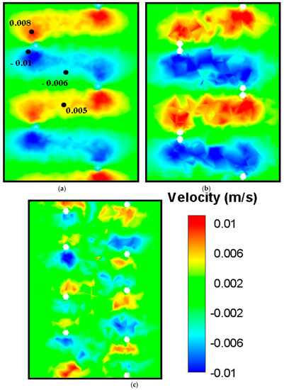 Figure 6. CFD simulations for radial velocity Vx plotted in the center-plane, increases from single flagellum (a) to in-phase double flagella configuration (b) and decreases for the out-of-phase double flagella configuration (c).