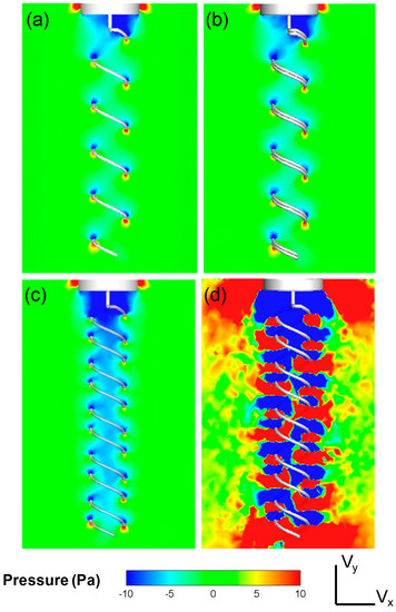 Figure 8. Pressure contours are plotted at the center-plane along the flagella axis for (a) single flagellum, (b) in-phase, (c) out-of-phase double flagella configurations inside less viscous oil (350 cSt) and (d) out-of-phase double flagella inside high viscous oil (30,000 cSt). Pressure drop across the flagella increased slightly for the out of-phase configuration and notably for the high viscous case compared to the single flagellum.