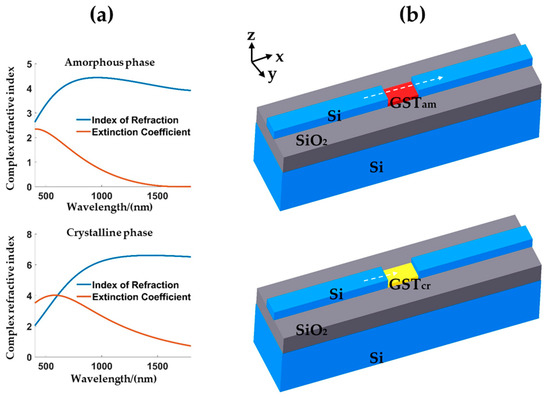 Phase change materials (PCMs), which have an extra-high complex refractive index contrast between two phase states, can be used to mitigate the above issues [5,6,7]. In recent years, the combination of nanophotonic components and PCM has been studied intensively. For example, vanadium dioxide (VO2) with semiconductor and metal phases [7] can be used to make optical switches. However, as VO2 is a volatile PCM, it is difficult to maintain the metal phase without power consumption. In contrast, another common PCM, Ge2Sb2Te5 (GST), has the “self-holding” feature, which means it does not need a continuous power supply to keep its state. Besides, the phase transition of GST occurs on a sub-nanosecond time scale [5]. Therefore, GST is a good material choice for implementing non-volatile miniature photonic devices [8,9].