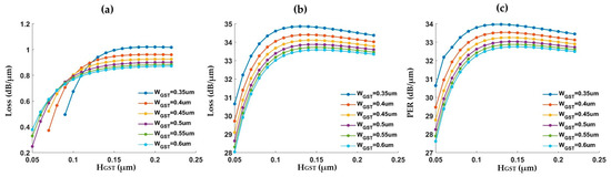 We next scanned the GST waveguide width and height in order to get an optimal design. Figure 3a,b show the propagation loss of the GST waveguide at the amorphous and crystalline states, respectively. The amorphous GST has a lower propagation loss. For a thin GST layer (less than ~75 nm), the loss decreases for a narrower GST waveguide. This is because the light cannot be well confined in the GST layer when the size is small, leading to an expanded mode. When the GST layer is thick enough (larger than ~75 nm), the loss is first reduced and then almost unchanged with an increasing waveguide width. On the other hand, the crystalline GST has good confinement of light even with a small waveguide size. It has a much larger propagation loss than the amorphous state. For a fixed width, the loss increases with the height and then slightly decreases; for a fixed height, the loss always decreases with a wider waveguide. Figure 3c shows the ER as a function of GST height with GST width as a variable. It generally follows the same trend as the waveguide propagation loss at the crystalline state.