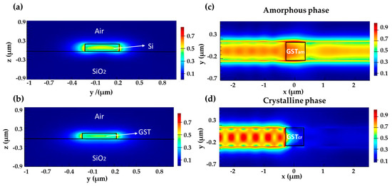 (a,b) Electric-field intensity mode profiles of (a) silicon waveguide and (b) amorphous GST waveguide. (c,d) Electric-field intensity distribution in the horizontal plane along the waveguide when GST is at (c) the amorphous state and (d) the crystalline state.