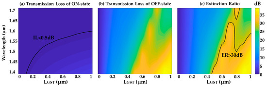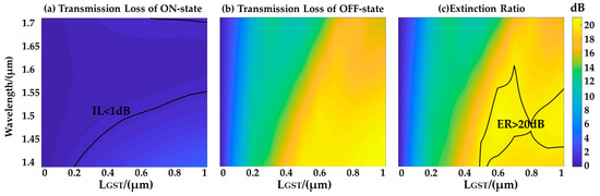 There is a compromise between the device IL and the ON-OFF switching ER. The IL is defined as the device optical transmission loss at the amorphous state. The ER is defined as the transmission loss difference between the amorphous state and the crystalline state. Figure 5 shows the optical transmission losses at the two states and the ER as a function of wavelength and GST length. The loss of ON-state (amorphous GST) increases when the wavelength deviates from the targeted 1550 nm wavelength because of the effective index mismatch. The loss of OFF-state (crystalline GST) does not monotonically increase with the GST length due to the Fabry-Perot resonant effect, given that the waveguide interface causes certain back reflection. It can be seen that when LGST is 0.6 μm, the device IL is less than 1 dB, and the ON-OFF switching ER is more than 20 dB in an optical bandwidth of 70 nm. When the GST section is longer than 1 μm, the ER can be further improved but at the cost of a higher IL.