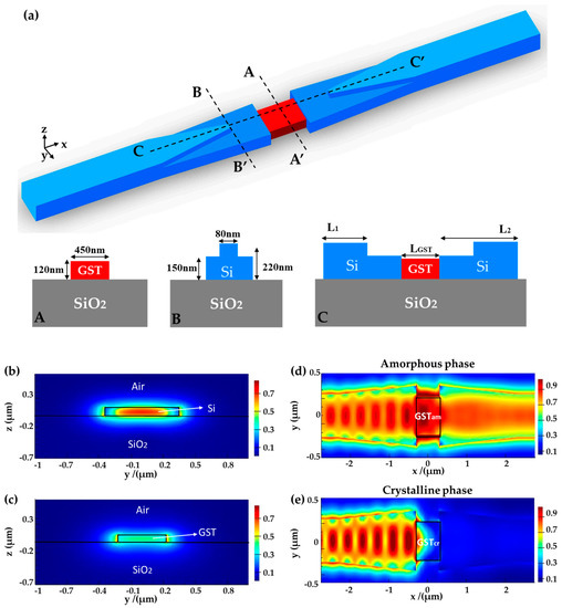 Figure 6b,c, show that the mode profiles of the silicon and GST waveguide match better than the previous design. The PCR is close to 0.968. Light propagates through the GST section with higher transitivity in the amorphous state but highly blocked in the crystalline state, as illustrated in Figure 6d,e.
