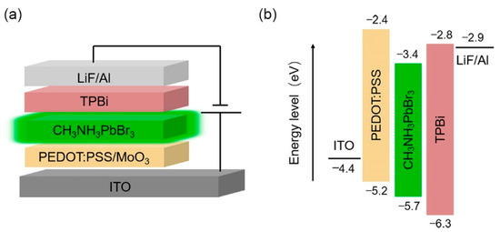 - Cho, H.C.; Jeong, S.H.; Park, M.H.; Kim, Y.H.; Wolf, C.; Lee, C.L.; Heo, J.H.; Sadhanala, A.; Myoung, N.; Yoo, S.; et al. Overcoming the electroluminescence efficiency limitations of perovskite light-emitting diodes. Science 2015, 350, 1222–1225. [Google Scholar] [CrossRef] [PubMed]
