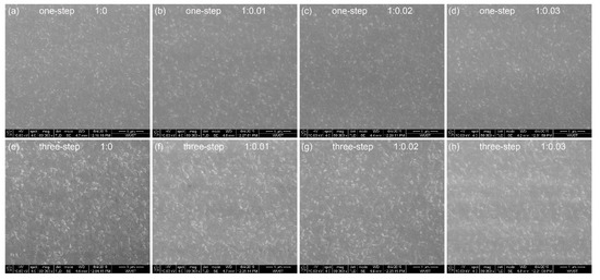 SEM images of the one-step spin-coated CH3NH3PbBr3 film samples on (a) PEDOT:PSS, (b) PEDOT:PSS/MoO3-ammonia (1:0.01), (c) PEDOT:PSS/MoO3-ammonia (1:0.02), (d) PEDOT:PSS/MoO3-ammonia (1:0.03) composite HTLs, and three-step spin-coated CH3NH3PbBr3 film samples on (e) PEDOT:PSS, (f) PEDOT:PSS/MoO3-ammonia (1:0.01), (g) PEDOT:PSS/MoO3-ammonia (1:0.02), (h) PEDOT:PSS/MoO3-ammonia (1:0.03) composite HTLs.