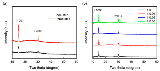 XRD patterns of (a) one-step and three-step coated CH3NH3PbBr3 films on the pure PEDOT:PSS film, (b) three-step coated CH3NH3PbBr3 films on the pure PEDOT:PSS film and PEDOT:PSS/MoO3-ammonia composite HTLs with different MoO3 ratios. The XRD patters were shifted vertically for clarity.