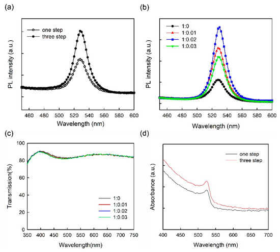 PL spectra of (a) one-step and three-step coated CH3NH3PbBr3 films on the pure PEDOT:PSS film, (b) three-step coated CH3NH3PbBr3 films on the pure PEDOT:PSS film and PEDOT:PSS/MoO3-ammonia composite HTLs with different MoO3-ammonia ratios. (c) The transmittance spectra of the pure PEDOT:PSS film and PEDOT:PSS/MoO3-ammonia composite HTLs with different MoO3-ammonia ratios. (d) The absorption spectra of one-step and three-step spin-coated perovskite films on pure PEDOT:PSS HTL.