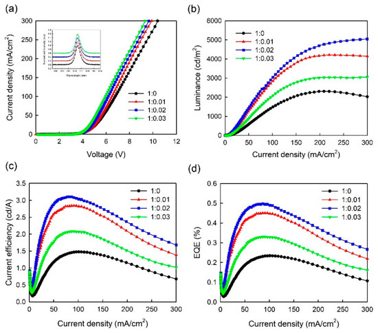 Figure 5 shows (a) the current density vs. voltage (J-V), (b) the luminance vs. current density (L-J), (c) the current efficiency vs. current density (CE-J), and (d) the EQE vs. current density (EQE-J) curves for the single-step CH3NH3PbBr3 PeLEDs with pure PEDOT:PSS and PEDOT:PSS/MoO3-ammonia (1:0.01, 1:0.02, 1:0.03) composite HTLs. These four devices are labelled as S1, S2, S3, and S4 for clarity respectively. The detailed device parameters of the PeLEDs (S1, S2, S3, S4) are summarized in Table 1. As shown in Figure 5a, on increasing the MoO3-ammonia ratio from 0 to 0.03, the turn-on voltage, which are defined as the driving voltage at ∼1 mA/cm2, decreases monotonically from 4.3 V to 4.14 V. Besides, the current density of the PeLEDs increases on increasing the MoO3-ammonia amount, suggesting a reduced energy barrier at HTL/EML interface, inducing more efficient hole injection into CH3NH3PbBr3 layer [25,26]. As described in the L-J, CE-J, and EQE-J characteristics, a maximum luminance of 1082 cd/m2, a maximum CE of 0.7 cd/A and a maximum EQE of 0.11% were observed in the device with the MoO3-ammonia ratio of 0.02 (device S3), indicating the optimal volume ratio, while for the control device with pure PEDOT:PSS HTL (device S1), the maximum luminance of 593 cd/m2 and maximum CE of 0.36 cd/A were obtained. Therefore, the optimized device shows a 82% enhancement in the maximum luminance and 94% enhancement in the maximum CE respectively.