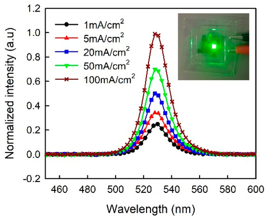 Figure 6 shows J-V, L-J, CE-J, and EQE-J curves for the three-step CH3NH3PbBr3 PeLEDs with pure PEDOT:PSS and PEDOT:PSS/MoO3-ammonia (1:0.01, 1:0.02, 1:0.03) composite HTLs, which are labelled as T1, T2, T3, and T4 for clarity respectively. The detailed device parameters of the PeLEDs (T1, T2, T3, T4) are summarized in Table 2. As shown in Figure 6a, on increasing the MoO3-ammonia ratio from 0 to 0.03, the turn-on voltage decreases from 4.08 V to 3.68 V. Besides, the current density of the PeLEDs increases on increasing the MoO3-ammonia amount, which is similar to the trend observed in one-step devices (S1, S2, S3, S4). As shown in Figure 6c,d, the CE and EQE increase at low current densities because of the rapidly increased luminance (or the number of excitons). On further increasing the current density, the luminance increases more slowly or decreases, leading to the decreased CE and EQE, namely the efficiency roll-off. As reported, the efficiency roll-off of OLEDs is mainly caused by charge imbalance and quenching processes [10,29,30]. Similarly, in this work, higher CE found in the device with the MoO3-ammonia ratio of 0.02 can be explained by the balance of electrons and holes in the EM, as well as the reduced exciton quenching. From the L-J, CE-J, and EQE-J characteristics, a maximum luminance of 5044 cd/m2, a maximum CE of 3.12 cd/A and a maximum EQE of 0.5% were also observed in the device with the optimal MoO3-ammonia ratio of 0.02 (device T3), while for the device with pure PEDOT:PSS HTL (device T1), the maximum luminance of 2309 cd/m2 and maximum CE of 1.47 cd/A were obtained. Thus, the optimized device shows a 118% enhancement in the maximum luminance and 112% enhancement in the maximum CE respectively. Compared with the control device with pure PEDOT:PSS HTL and one-step spin-coated CH3NH3PbBr3 film (device S1), a 750% enhancement in the maximum luminance and 767% enhancement in the maximum CE were obtained for the optimized device (device T3). The inset in Figure 6a shows the normalized EL spectra of three-step CH3NH3PbBr3 PeLEDs using PEDOT:PSS/MoO3-ammonia composite HTLs with different amounts of MoO3-ammonia, in which all PeLEDs have an EL peak at ∼528 nm. Figure 7 shows the EL curves measured at different current densities. The results indicate that all PeLEDs have an EL peak at ~528 nm, suggesting the color stability of our devices.