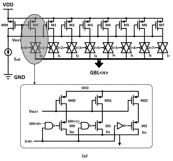 Figure 9 shows the fully differential high-speed readout circuit, which is based on the voltage-bias current readout scheme, included in this paper. The whole readout circuit can be divided into five parts: Clamp Circuit, Fully Differential Current Comparator, Optional Iref, Self-bias Voltage Comparator, and Readout Inverter. The Clamp Circuit controls the bit line voltage to Vclamp–Vth0 with a single transistor NM0. By setting Vclamp and Vth0 reasonably, the bit line voltage can be limited under the threshold voltage of the PCM cell. This approach has a great bandwidth and can provide a fast clamping operation. Furthermore, in order to avoid the effect of path parasitic charge on the PCM cells during the whole read operation, a discharge transistor NM5 is added to the readout circuit. The fully differential current comparator is composed of two sets of current mirrors which are cross-coupled. It can quickly respond to the difference between Iread and Iref and amplify them into differential voltage signals V1 and V2. Since there are multiple readout windows when reading each cell, the reference current source is designed to be optional. Firstly, three standard reference currents that can be changed by adjusting configuration parameters are generated by the bias circuit module inside the chip. Then, the high-bit reference current source is selected for the first read operation, and the reference current is mirrored into the current comparator through the current mirror composed of PM5. Finally, the selection of the current reference source during the second read operation is determined by the logic circuit controlled by the first readout result. The generated differential voltage signals V1 and V2 are then delivered to the Self-bias Voltage Comparator. It consists of two inverters and a pair of complementary MOSFET. The inverters composed of PM7 and NM7 are used to invert differential voltage signal V1. Additionally, the inverted V1 shifts the threshold of the second inverter, which is composed of PM8 and NM8, to the opposite direction by controlling the working state of PM6 and NM6. Then, the second inverter can respond more quickly to the change of differential voltage signal V2 and output the final result. The Readout Inverter is used to reverse the output of the Self-bias Voltage Comparator and recover the electrical level of the output signal.